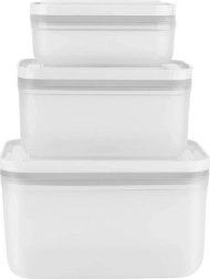 Le set de trois boîtes compactes Fresh & Save (taille S) est conçu pour le stockage quotidien des aliments. Le couvercle doté d’une valve sous vide centrale et d’un joint d’étanchéité limite l’entrée d’air, ce qui aide à prolonger la fraîcheur et à réduire le gaspillage alimentaire.
