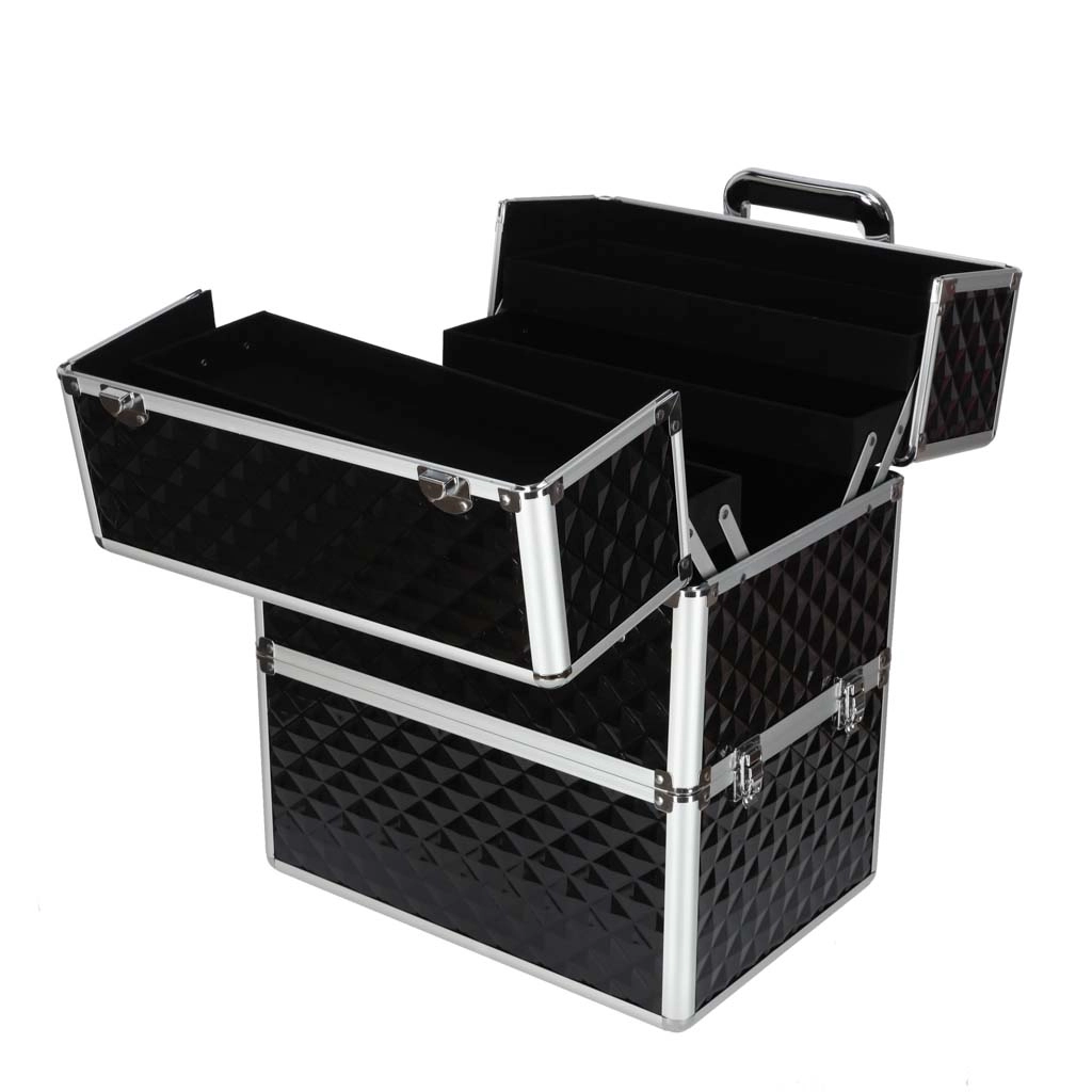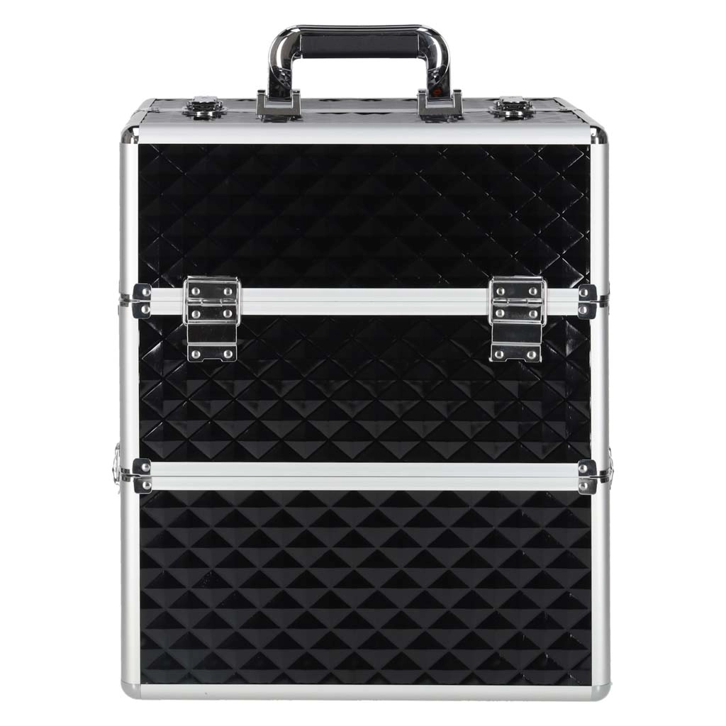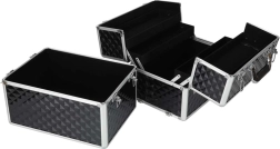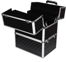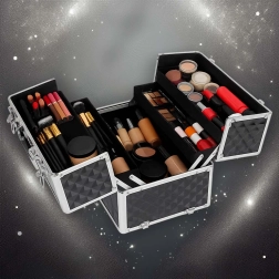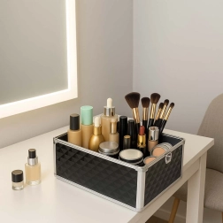 Cette grande mallette de maquillage de style « train case » propose un agencement intelligent : à l’ouverture du couvercle, quatre compartiments clairs se déploient, et la partie inférieure offre une grande chambre profonde pour les produits volumineux, flacons et outils. Sa fabrication durable, avec bords en aluminium et coins renforcés, protège le contenu lors des déplacements comme au quotidien.