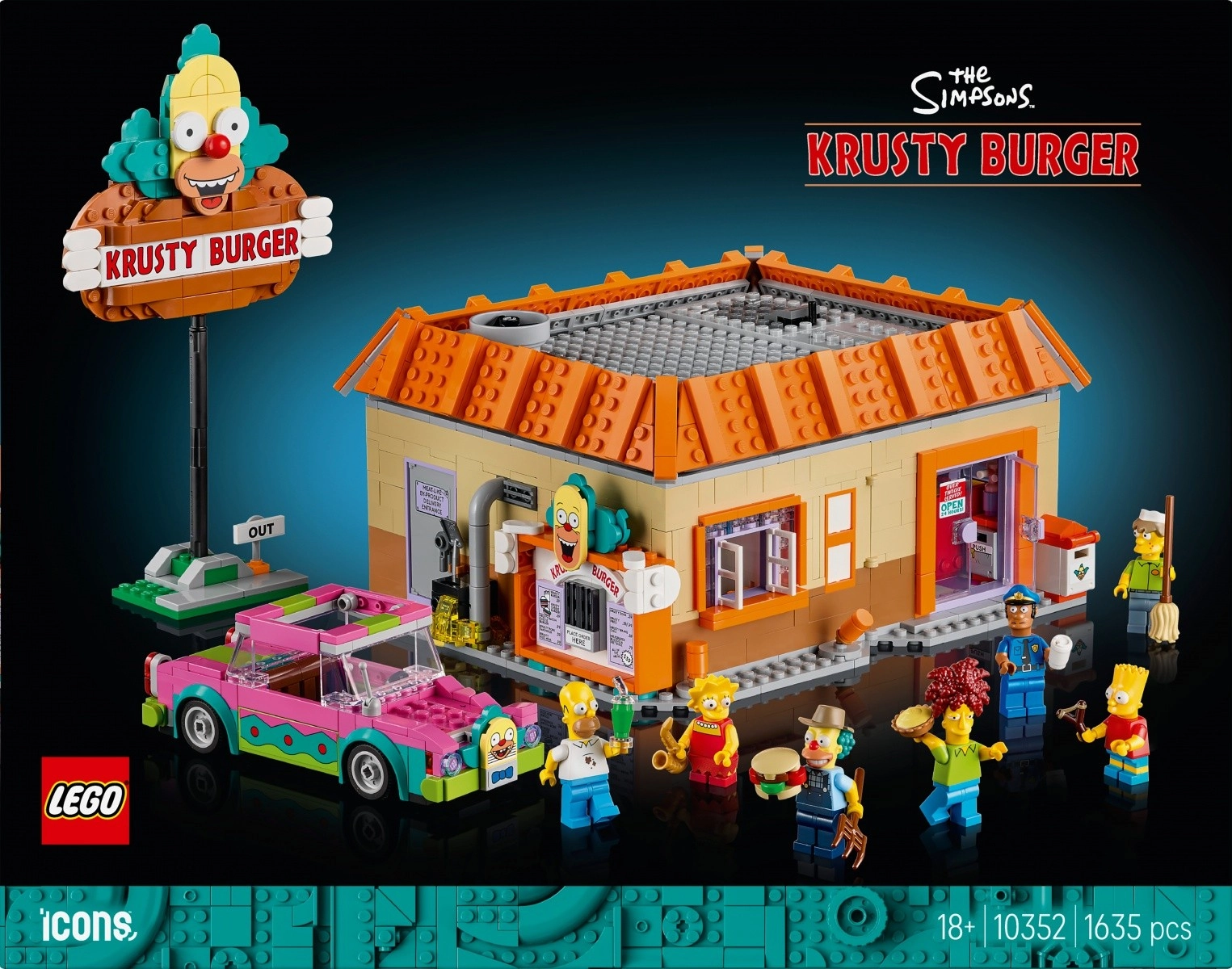 - Restaurant Krusty Burger, enseigne extérieure, voiture rose, minifigurines (Homer, Bart, Lisa, Krusty, Sideshow Bob, Squeaky Voiced Teen, Officer Lou)