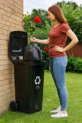 Le conteneur robuste de 120 L pour déchets ménagers est fabriqué en HDPE de qualité, résistant aux UV, aux produits chimiques et aux dommages mécaniques. Le couvercle étanche empêche l’eau de pénétrer et les odeurs de s’échapper, gardant ainsi les abords propres et hygiéniques. Grâce aux poignées ergonomiques et aux roues en caoutchouc sur axe métallique, la poubelle se déplace confortablement même bien chargée.
