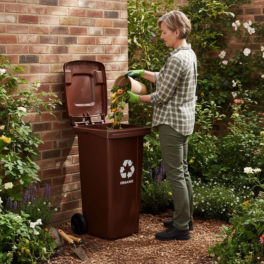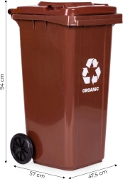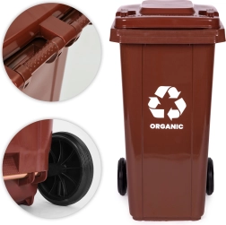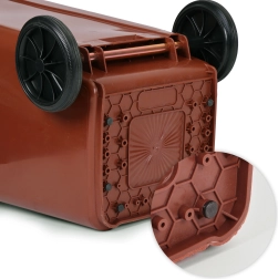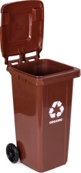Poubelle marron pratique pour biodéchets, capacité 120 l, en HDPE résistant, certifiée EN-840. Elle offre des roues en caoutchouc et des poignées ergonomiques pour un déplacement facile, un couvercle verrouillable contre la pluie et les odeurs, ainsi que des pieds de stabilisation pour plus de sécurité sur les surfaces glissantes. Idéale pour les foyers et les entreprises, résistante aux UV, aux produits chimiques et aux dommages mécaniques.