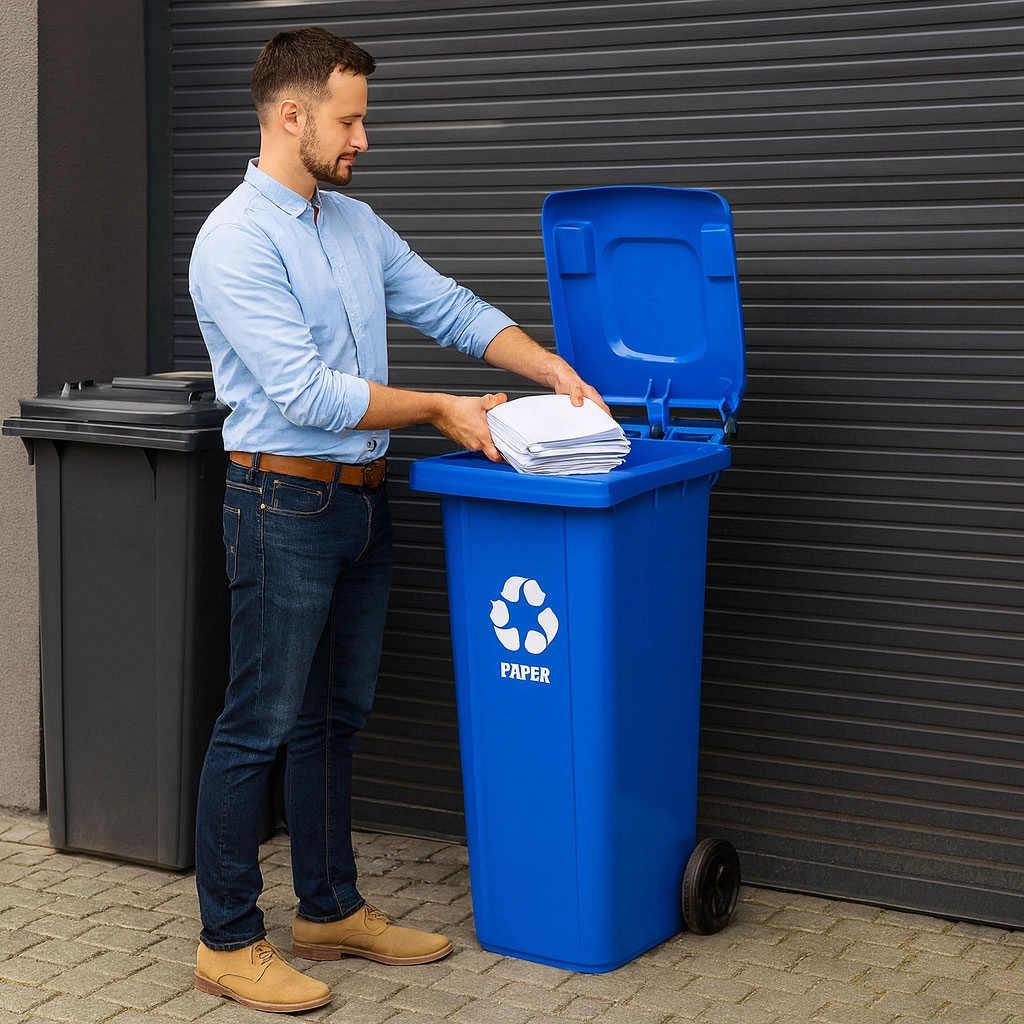 Compatible avec les équipements de collecte municipale (EN 840) et, grâce à ses pieds de stabilisation, il reste sûr même sur surfaces humides ou glissantes. Un excellent choix pour le tri du papier à la maison, au bureau, en atelier ou à l’école.