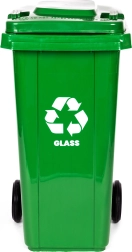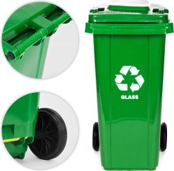 Conteneur pratique et résistant pour le tri du verre d’une capacité de 120 l, en PEHD résistant aux UV, aux produits chimiques et aux dommages mécaniques. Roues en caoutchouc et poignée ergonomique pour une manipulation aisée, couvercle étanche protégeant de la pluie et des odeurs. La stabilité sur surfaces glissantes est renforcée par des patins antidérapants. Convient aux particuliers comme aux entreprises, compatible avec la collecte municipale selon la EN 840 et certifié ISO9001, ISO14001, ISO45001.