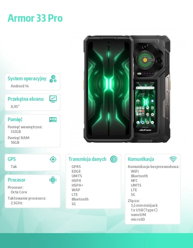 La batterie monstrueuse de 25 500 mAh tient plusieurs jours sans recharge, la prise en charge 66 W réduit le temps de remplissage et la charge inversée 10 W redonne vie à vos autres appareils. Avec les certifications IP68/IP69K et MIL‑STD‑810H, l’Armor 33 Pro ne craint ni l’eau, ni la poussière, ni les chocs. Evidemment, il offre la 5G, le Wi‑Fi 6, le Bluetooth 5.4, le NFC, une navigation précise ainsi qu’une pratique prise jack 3,5 mm et un USB‑C.