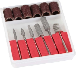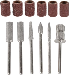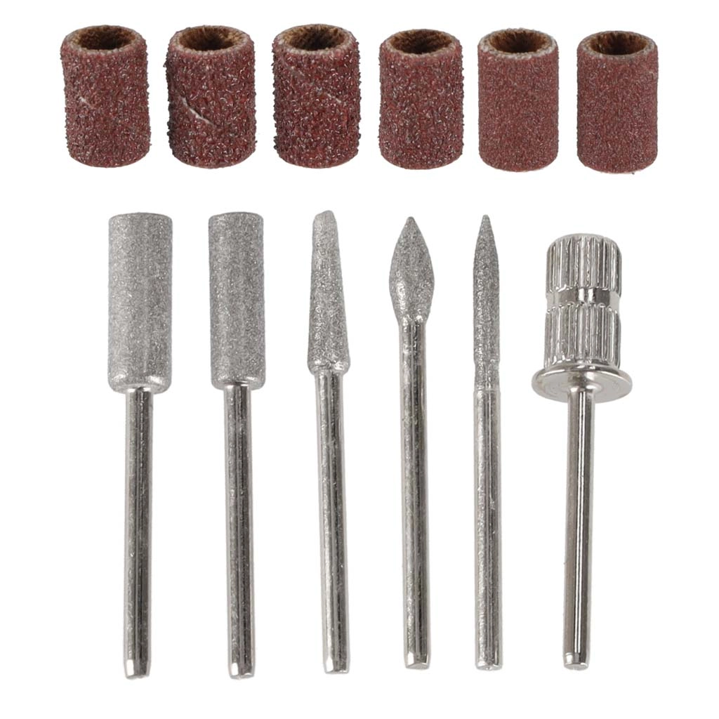 - Équipement complet : 6 fraises métalliques (pointue, cylindrique, conique, boule, aiguille, mandrin pour bagues abrasives) + 6 manchons abrasifs de différents grains.