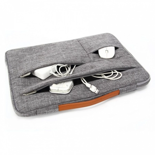 Une organisation bien pensée offre un compartiment principal pour l’ordinateur et plusieurs poches frontales pour l’adaptateur secteur, la souris, les câbles, les disques externes ou les cartes mémoire. La fermeture éclair à double sens facilite l’insertion et le retrait de l’appareil, et la poignée supérieure robuste assure un transport confortable.