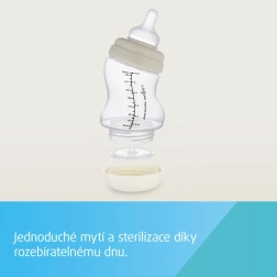 Le biberon S-Shape a été conçu pour une tétée calme et naturelle. Sa forme unique garde la tétine toujours remplie de lait même en position inclinée, ce qui limite l’absorption d’air. La valve anti-coliques située en bas évacue l’air du biberon et aide à prévenir coliques, crampes et ballonnements. Grâce au large goulot et à la base amovible, le biberon se démonte et se nettoie facilement.