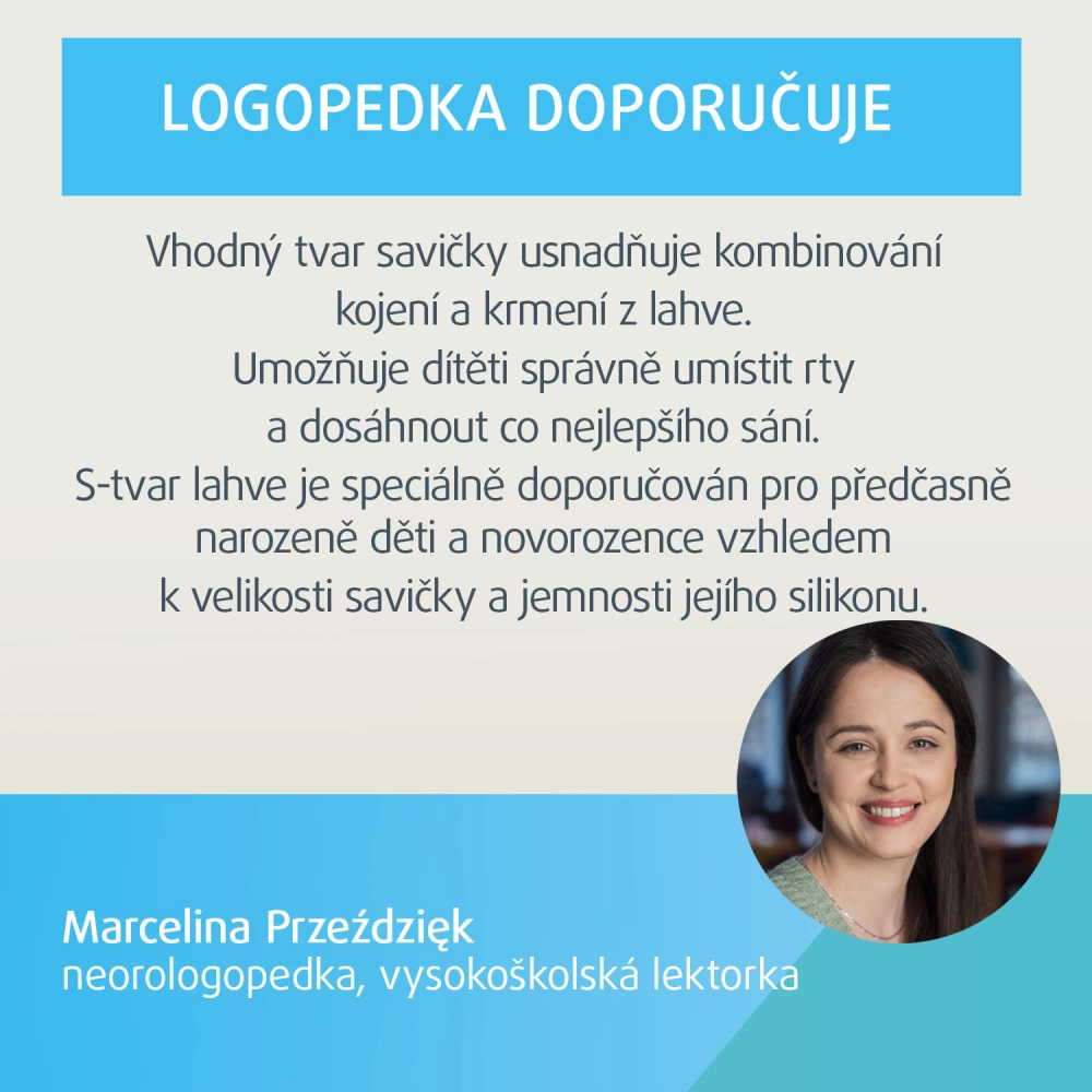 La forme S-Shape unique maintient la tétine pleine de lait même en angle et augmente le confort pour les parents comme pour l'enfant.