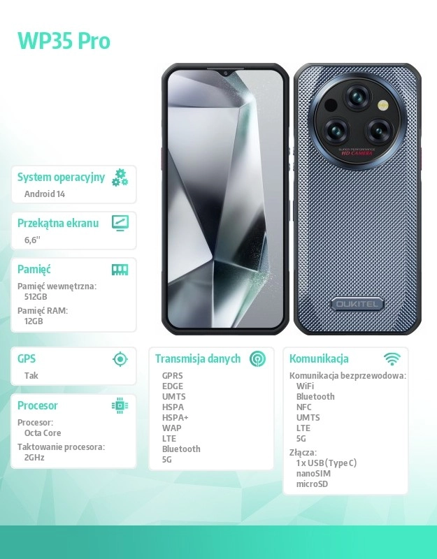 Vous cherchez un téléphone qui supporte les traitements rudes et les longues sorties sans chargeur ? OUKITEL WP35 Pro 5G combine une batterie massive de 11 000 mAh et l’un des corps robustes les plus fins de sa catégorie (15,2 mm). Grâce à l’écran 6,6" FHD+ Gorilla Glass 5, vous profitez d’une image nette et d’une résistance aux rayures, tandis que la 5G et le chipset MediaTek Dimensity 6300 (8 cœurs, 2,2 GHz) garantissent une utilisation fluide.