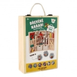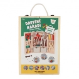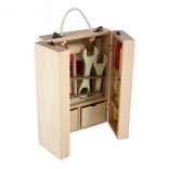 Découvrez une mallette à outils en bois de qualité qui permet aux enfants d’imiter en toute sécurité le monde des adultes. Le set comprend des tournevis, un marteau, des clés, des écrous, des vis, une équerre, une règle, une scie et d’autres accessoires. Le tout est rangé de manière claire dans une mallette solide avec poignée pour un transport facile.