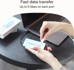 Transformez un port USB‑C en quatre ports USB‑A 3.0 fiables. Connectez clés USB, claviers, souris et disques externes, et travaillez confortablement sans rebrancher en permanence. Chaque port offre un débit jusqu’à 5 Gb/s pour des copies et une synchronisation rapides.