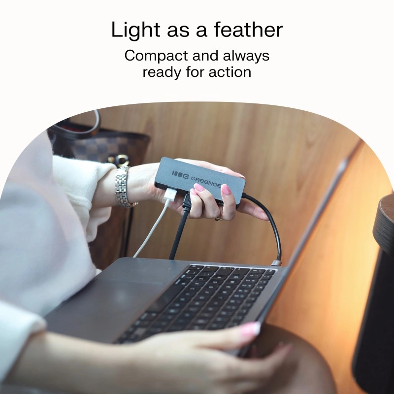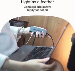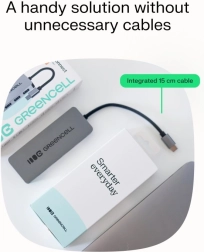 Le boîtier compact en aluminium est résistant et s’accorde parfaitement avec les ordinateurs portables modernes. Le câble intégré (15 cm) maintient votre bureau ordonné et le hub se glisse facilement dans une poche ou un sac – idéal en mobilité.