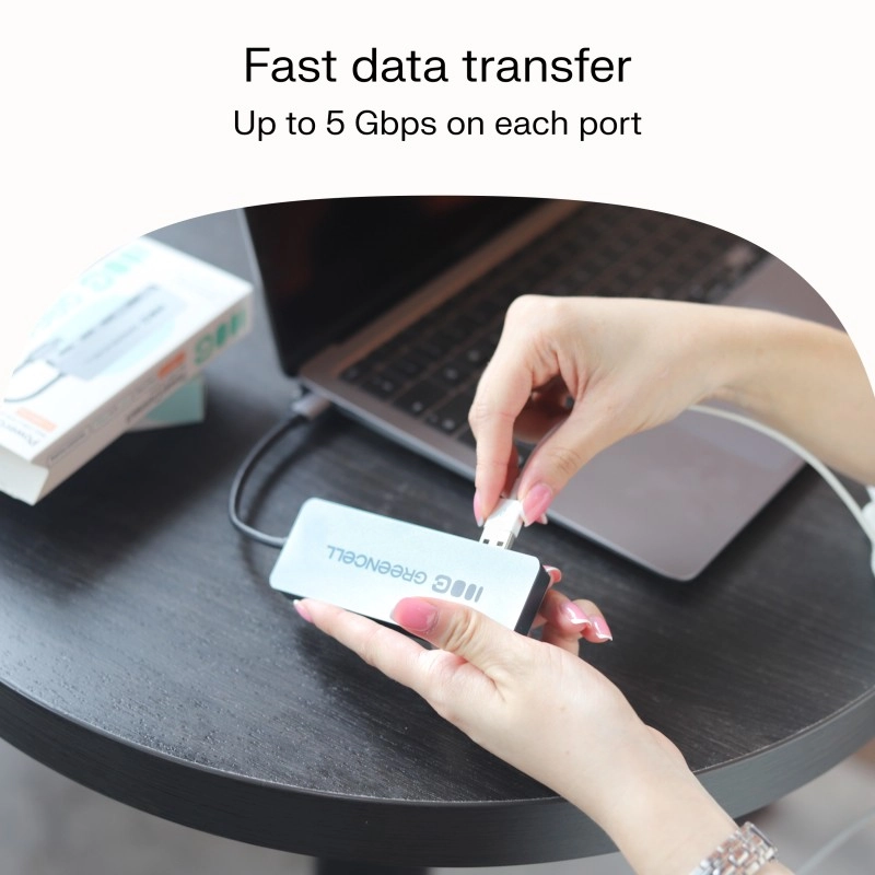 Étendez un port USB‑C en 4× USB‑A 3.0 avec le hub Greencell Basic. Il offre un transfert rapide jusqu’à 5 Gb/s sur chaque port, un design compact avec câble intégré de 15 cm et une large compatibilité avec Windows, macOS et les ordinateurs portables APPLE équipés de puces M3/M4.