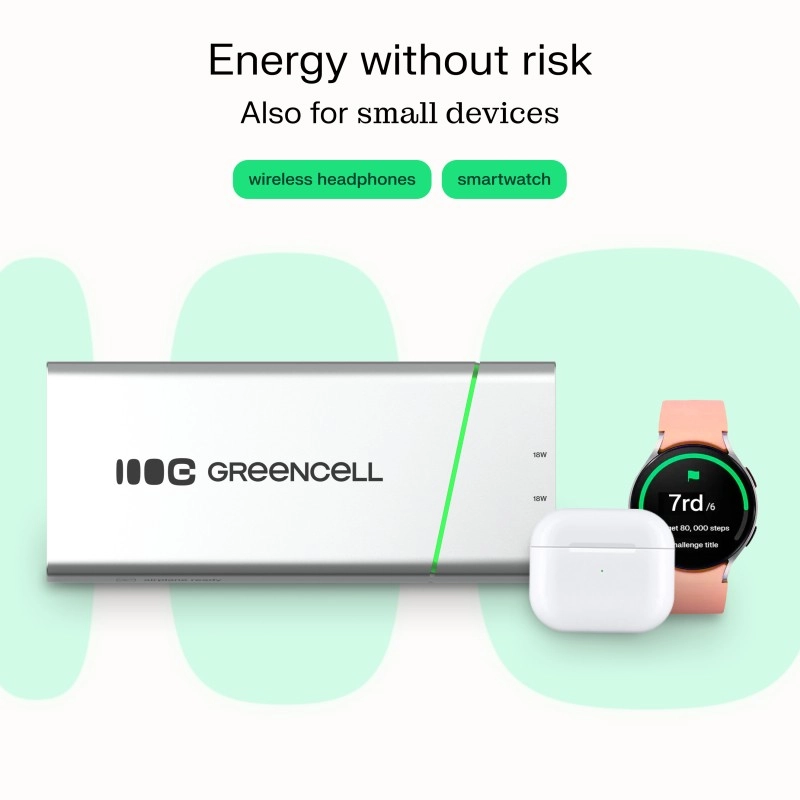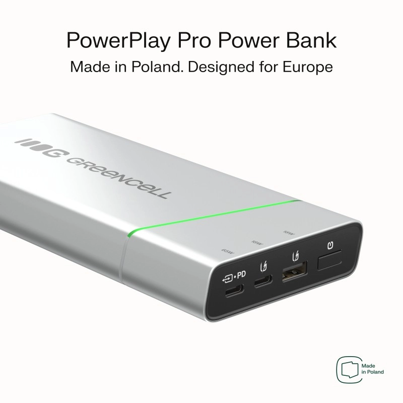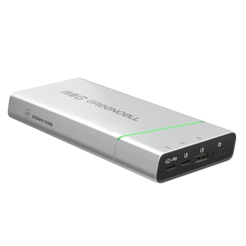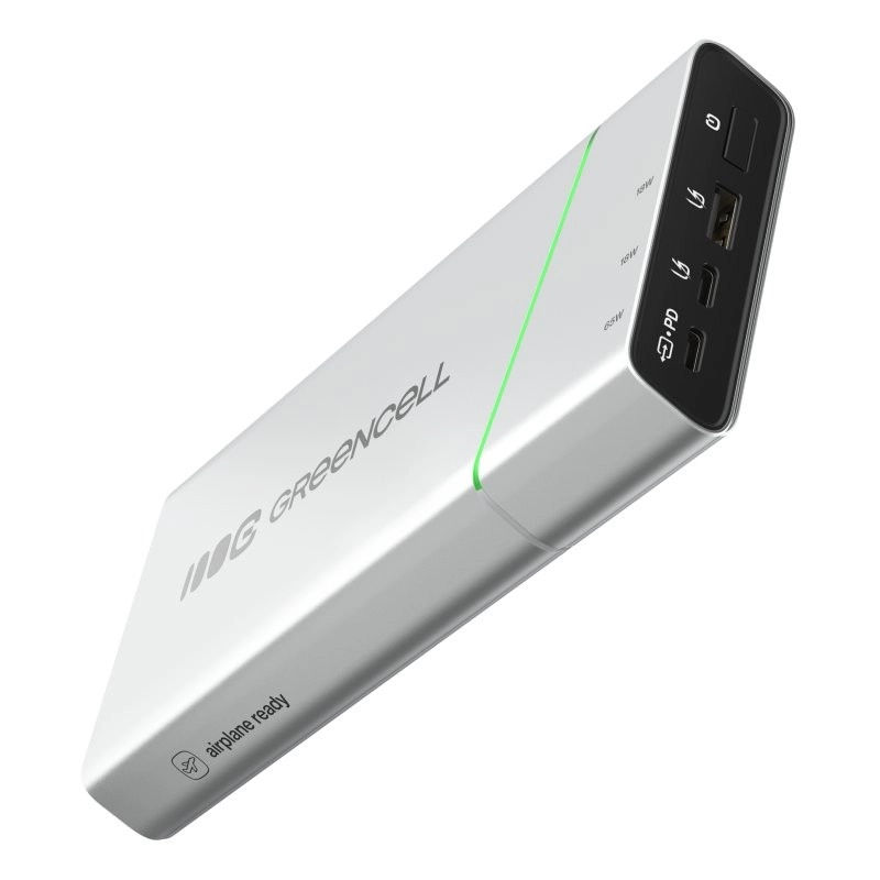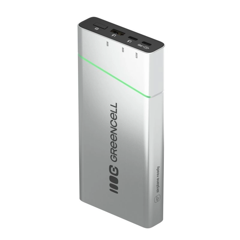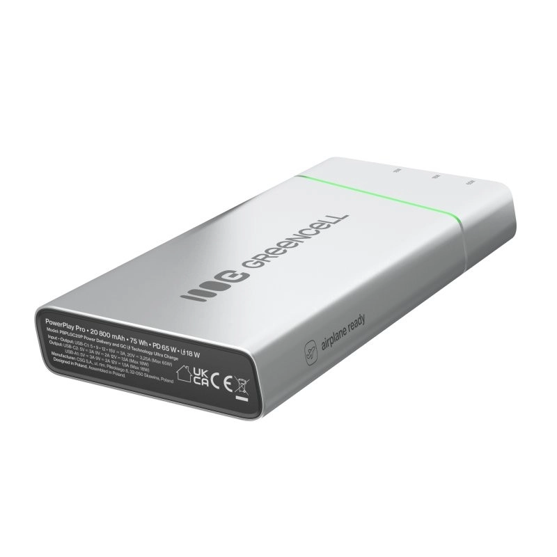 Batterie externe GREENCELL PowerPlay Pro compacte et puissante offrant une capacité de 20 800 mAh et une charge rapide USB-C Power Delivery 65 W. Grâce à 2× USB‑C et 1× USB‑A avec la technologie Ultra Charge, elle recharge en un éclair ordinateur portable, téléphone et écouteurs. Construction robuste, jusqu’à 1000 cycles de charge et protection complète contre les surtensions, les courts‑circuits et la surcharge. Idéale pour le voyage et autorisée en avion.