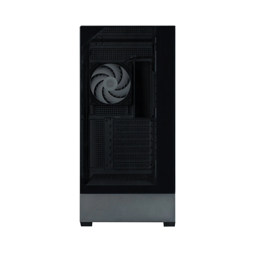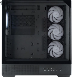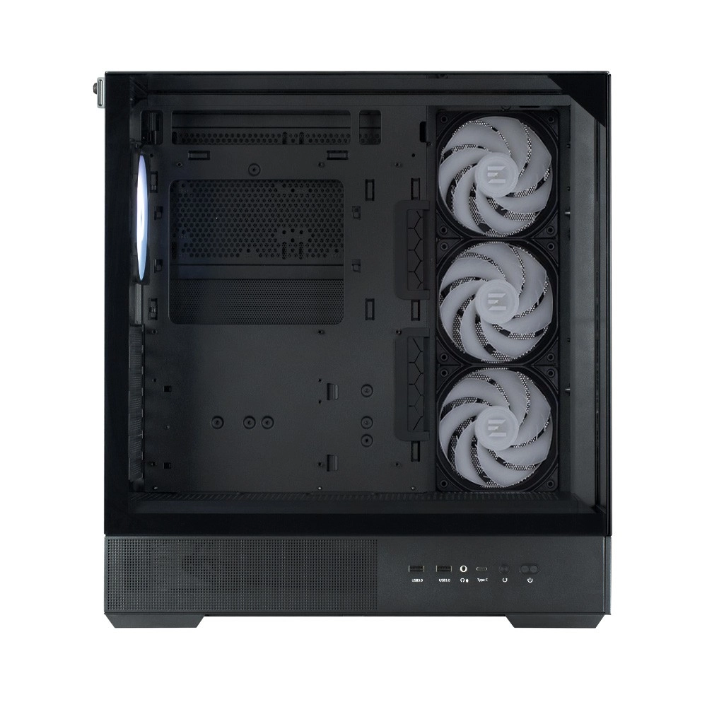 Le boîtier est conçu avec un accent sur la fonctionnalité : un panneau latéral entièrement maillé au‑dessus de la zone de la carte mère favorise un airflow optimal, un système porteur triangulaire robuste supporte jusqu’à 35 kg et un espace de 33 mm derrière le plateau, associé à des passe‑câbles en caoutchouc, maintient le câblage parfaitement ordonné.