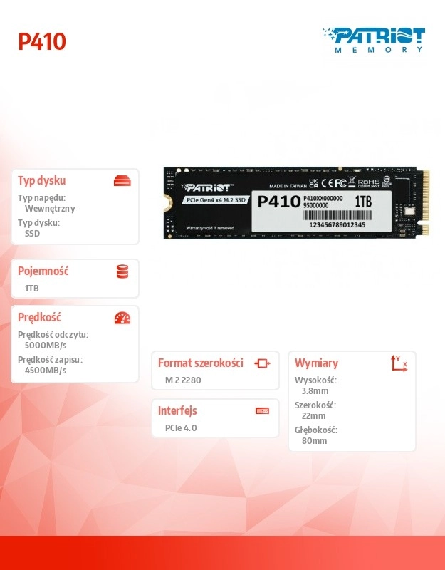 Le Patriot P410 propose une interface moderne PCIe Gen4 x4 et le protocole NVMe 1.4 pour une réactivité fulgurante du système, des chargements de jeux plus courts et des transferts de données rapides. Son format fin M.2 2280 assure une compatibilité sans problème avec la plupart des PC de bureau et ordinateurs portables.