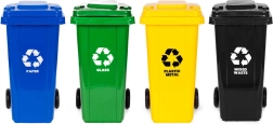 - Bleu – papier ; Vert – verre ; Jaune – plastique/métal ; Noir – déchets mixtes