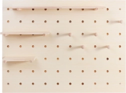 Le panneau pegboard en bois MACLEAN associe l’élégance du bois clair à une fonctionnalité pratique. Le système de trous permet de déplacer librement 3 étagères amovibles et 5 crochets/chevilles, afin de créer facilement votre propre agencement pour les objets du quotidien. Idéal pour l’entrée, le bureau, la cuisine et l’atelier.