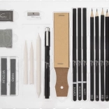 Tous les outils sont soigneusement assemblés pour couvrir diverses techniques – des croquis rapides aux études élaborées. Les estompes (tortillons) permettent un modelé tonal fluide, tandis que la gomme et le taille-crayon assurent des corrections précises et une préparation immédiate au travail.