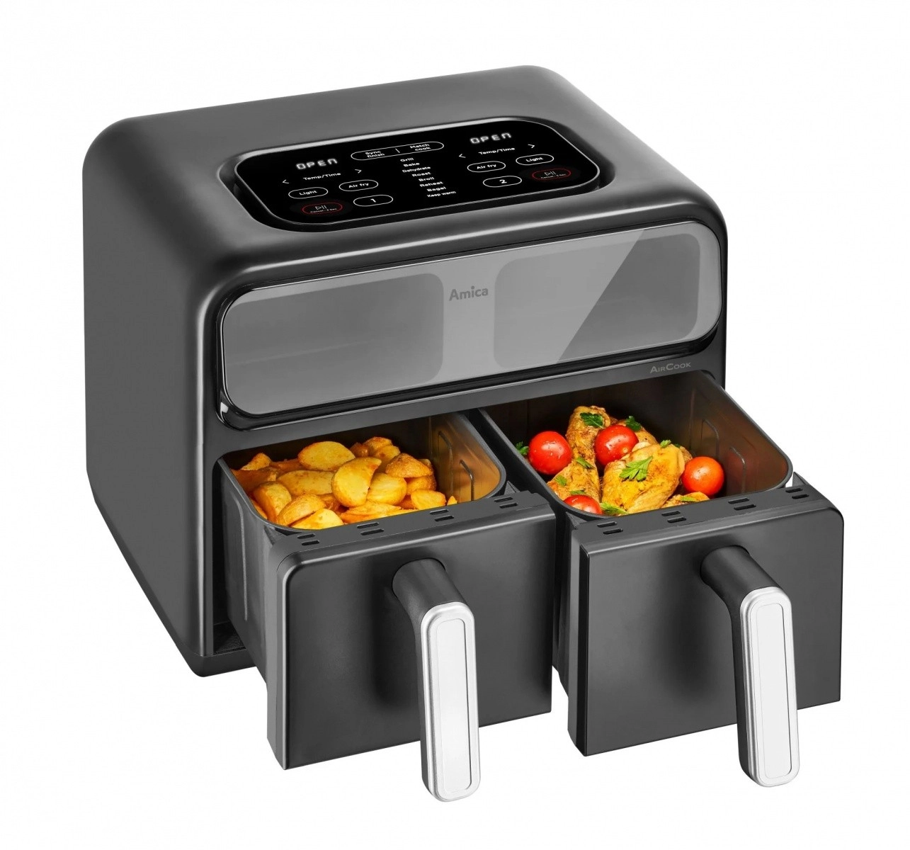 Découvrez une façon de cuisiner plus rapide et plus saine. La friteuse à air à deux chambres prépare vos plats préférés avec un minimum de matières grasses grâce à la circulation intensive d’air chaud. Les deux zones indépendantes permettent de cuire et frire différents ingrédients en même temps, et grâce aux hublots vous gardez toujours un œil sur la préparation sans ouvrir inutilement les tiroirs.
