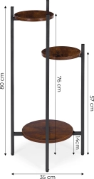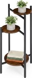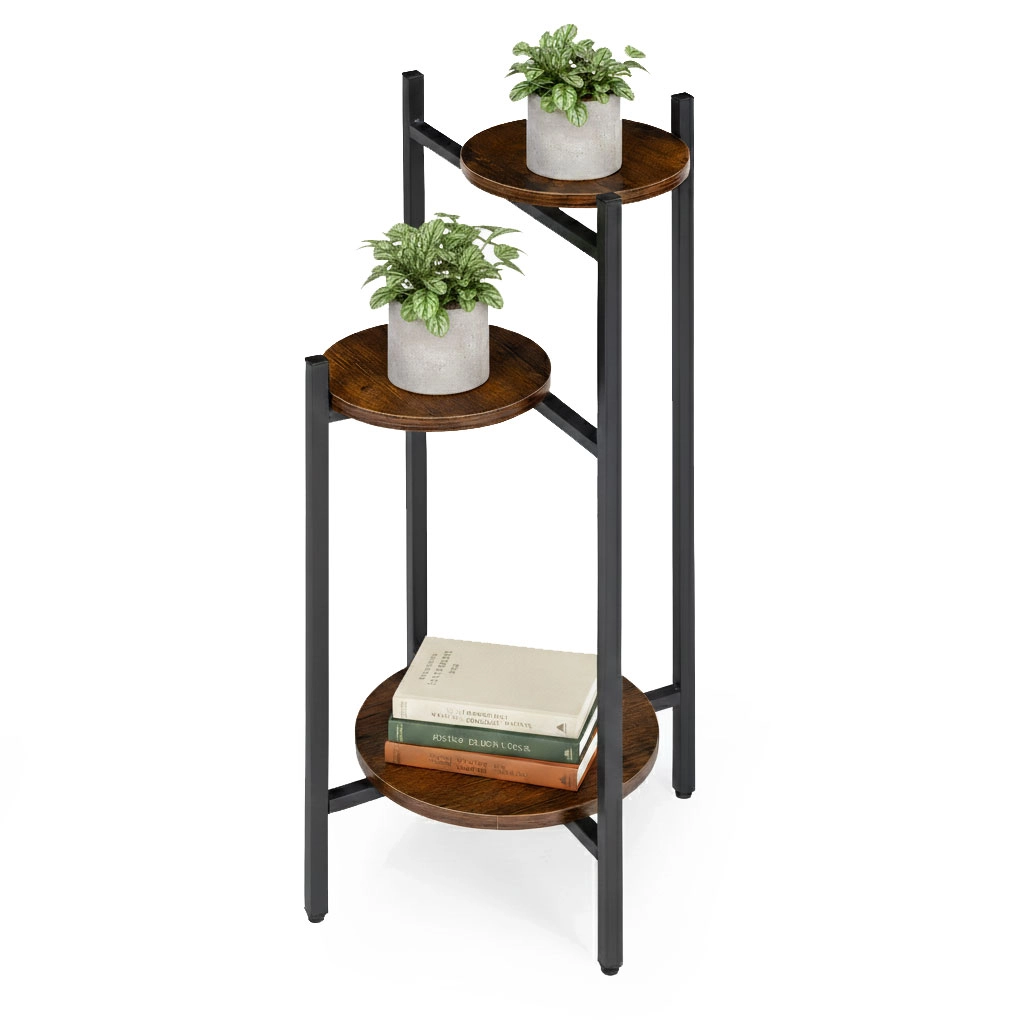 Support à plantes à trois étages au style loft industriel, combinant une structure en acier robuste et des étagères aspect bois. Grâce à ses dimensions compactes et à sa disposition verticale, il économise de la place dans le salon, le bureau ou sur le balcon, tout en offrant stabilité, pieds antidérapants et une capacité de charge jusqu’à 15 kg.