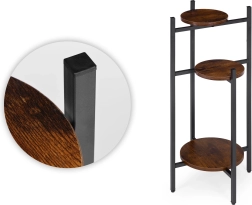 La structure en acier peint par poudrage garantit une résistance à la corrosion et à l’usure mécanique, tandis que les étagères rondes en aggloméré aspect bois apportent chaleur et caractère. Les pieds antidérapants protègent le sol et renforcent la stabilité, ce qui rend le support adapté même aux zones de passage.