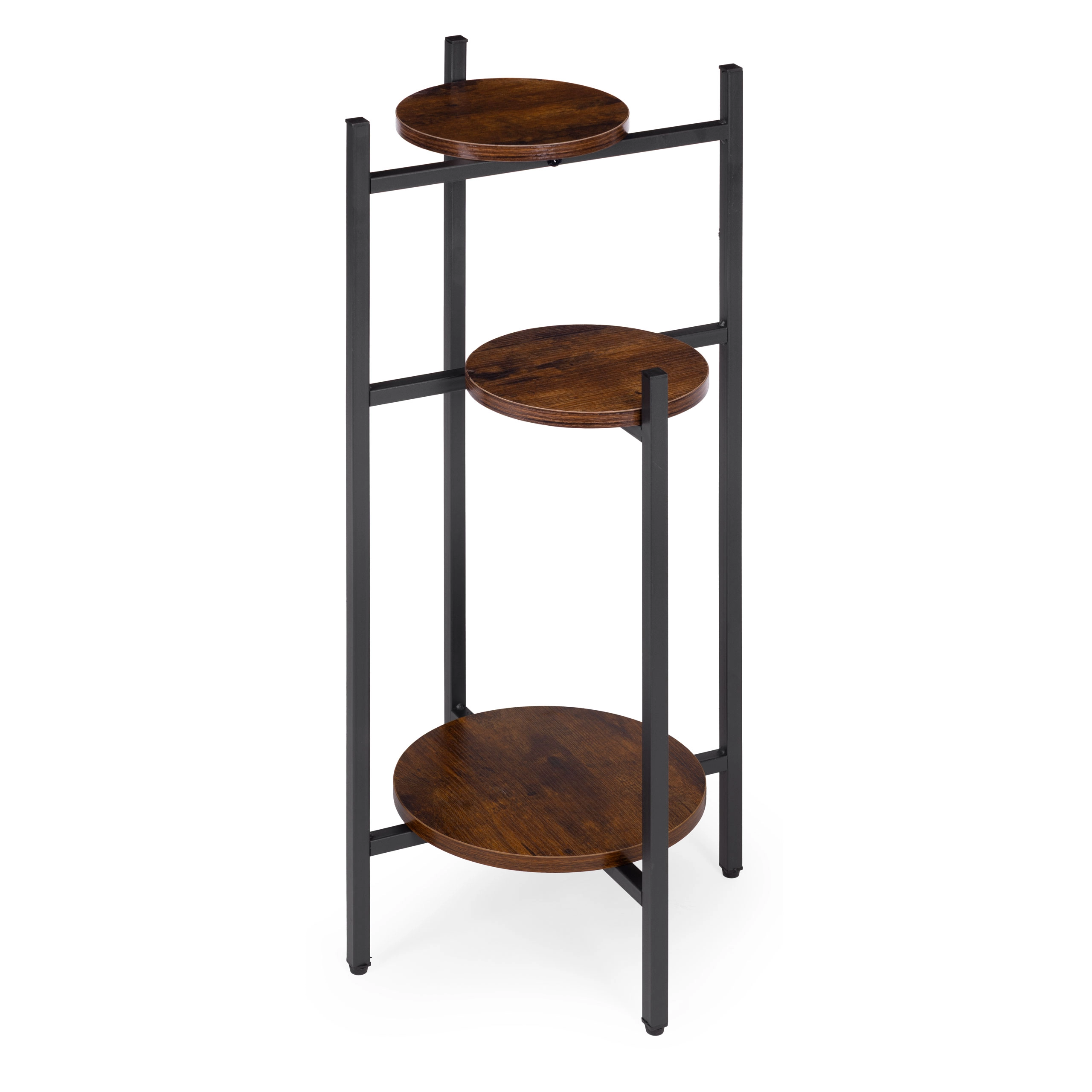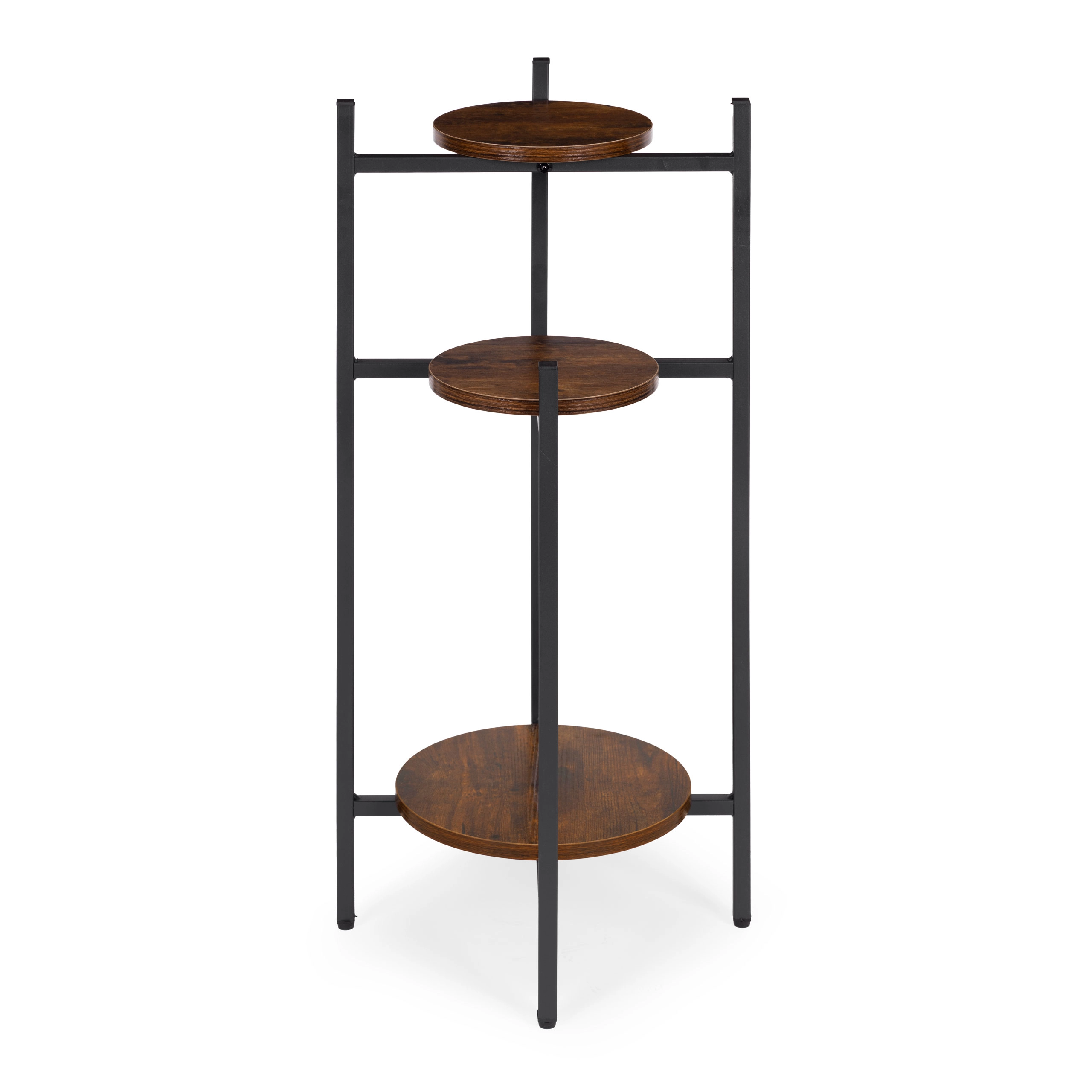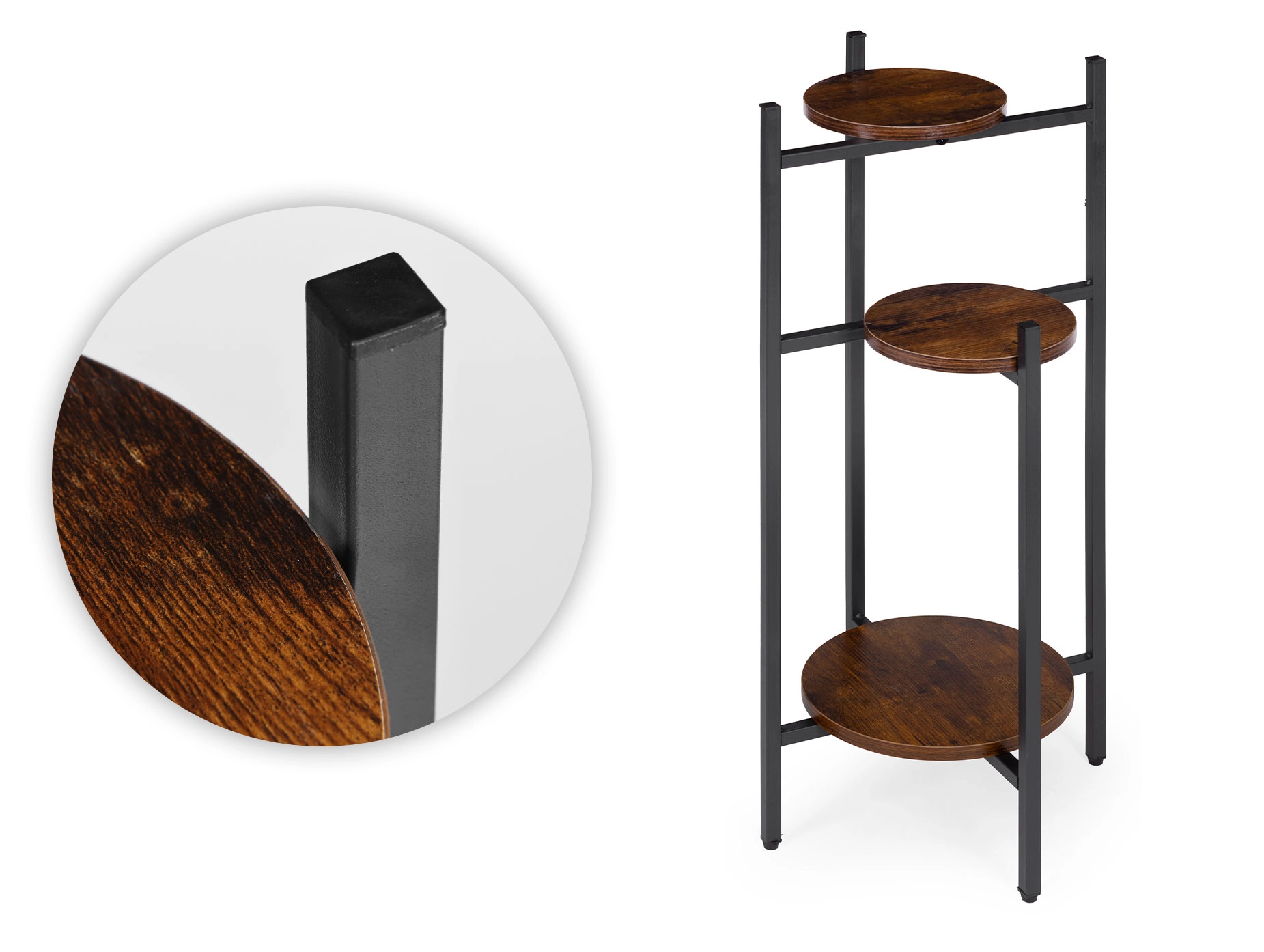 Trois étagères rondes à différentes hauteurs permettent d’exposer davantage de plantes sans occuper une surface au sol précieuse. Idéal pour les coins, près d’une fenêtre ou à côté du canapé.