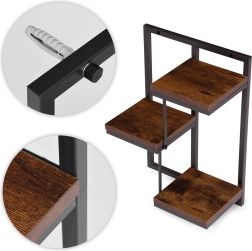 Structure en acier résistante avec peinture thermolaquée, résistante à la corrosion et à l’usure mécanique, tandis que les étagères en panneau de particules laminé au décor bois soulignent son élégance. Un système de fixation bien pensé, avec trous pré-percés et chevilles/vis fournies, assure une stabilité parfaite même sous charge plus élevée.