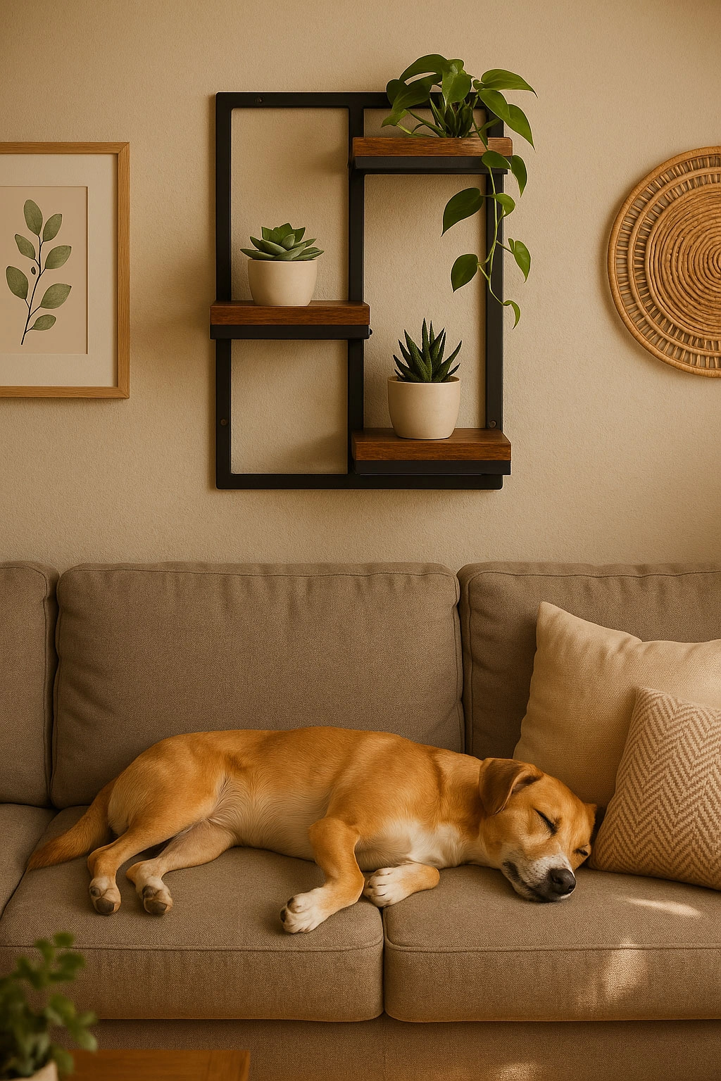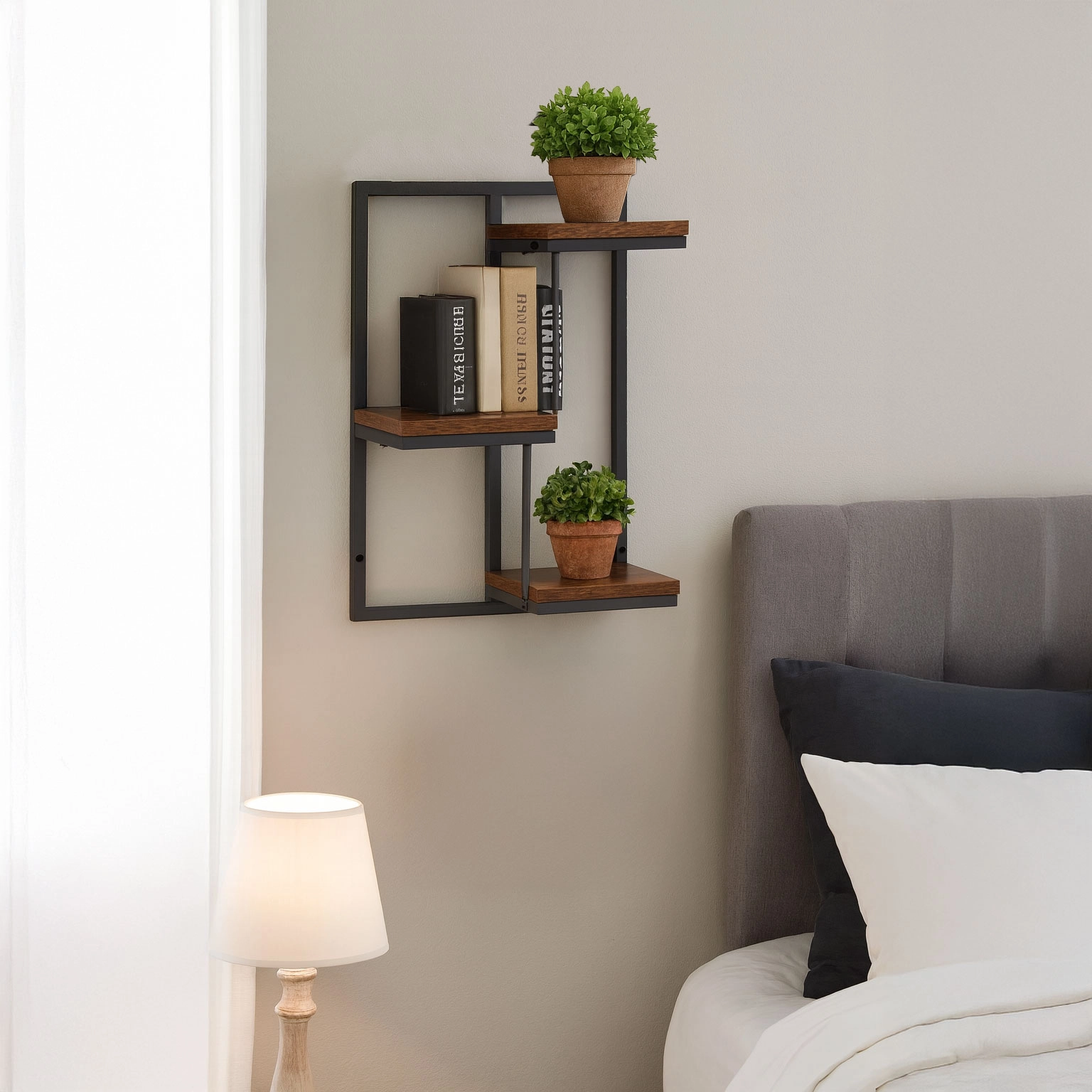 Trois étagères disposées en alternance offrent suffisamment d’espace pour les herbes, les succulentes et les décorations, sans occuper la surface au sol.