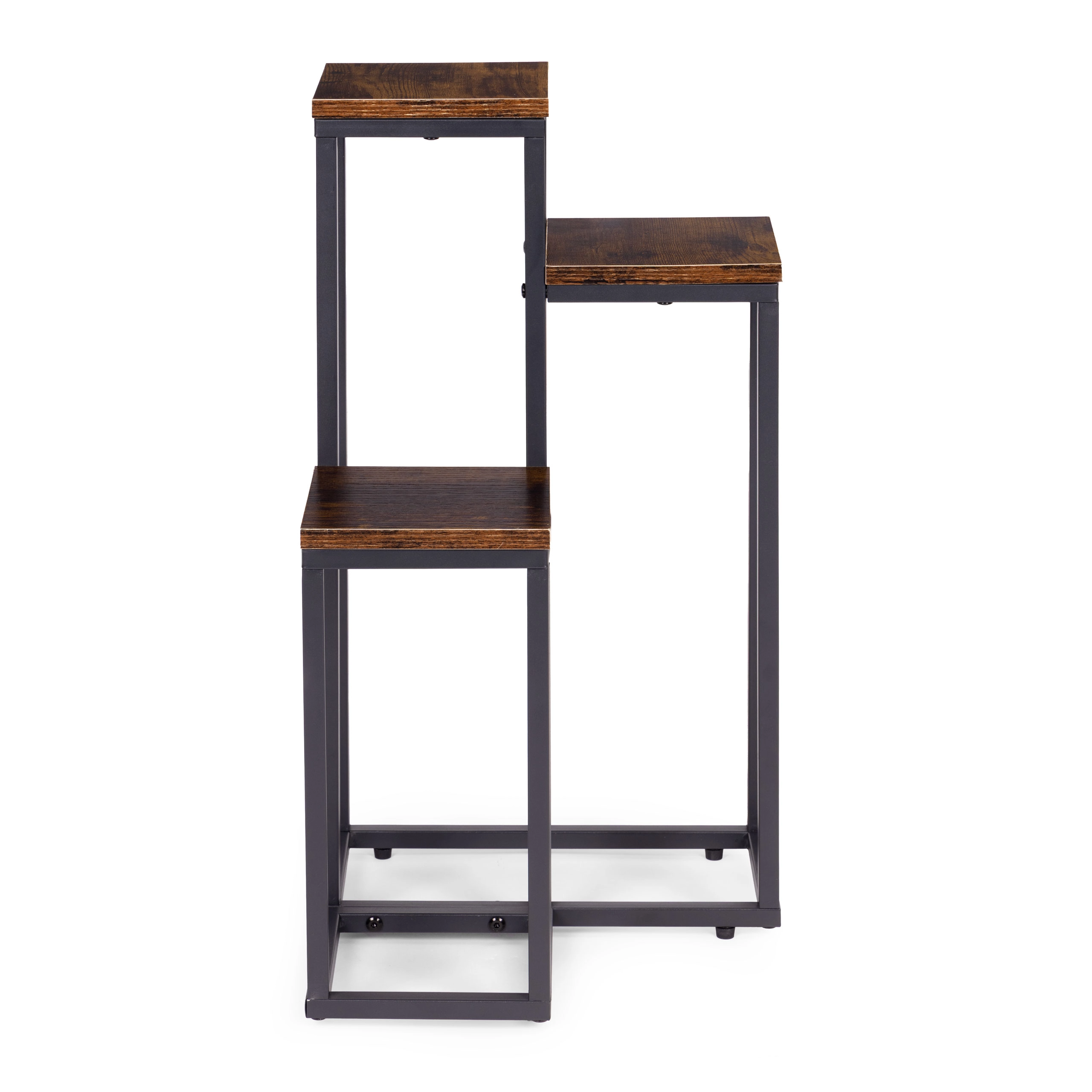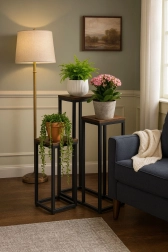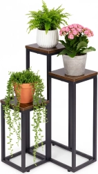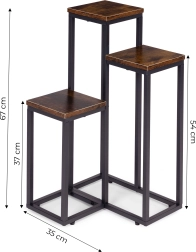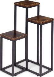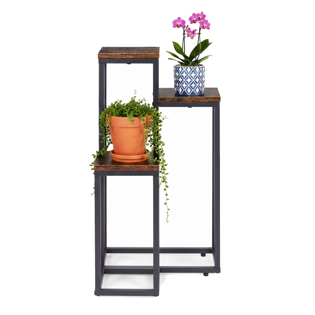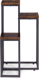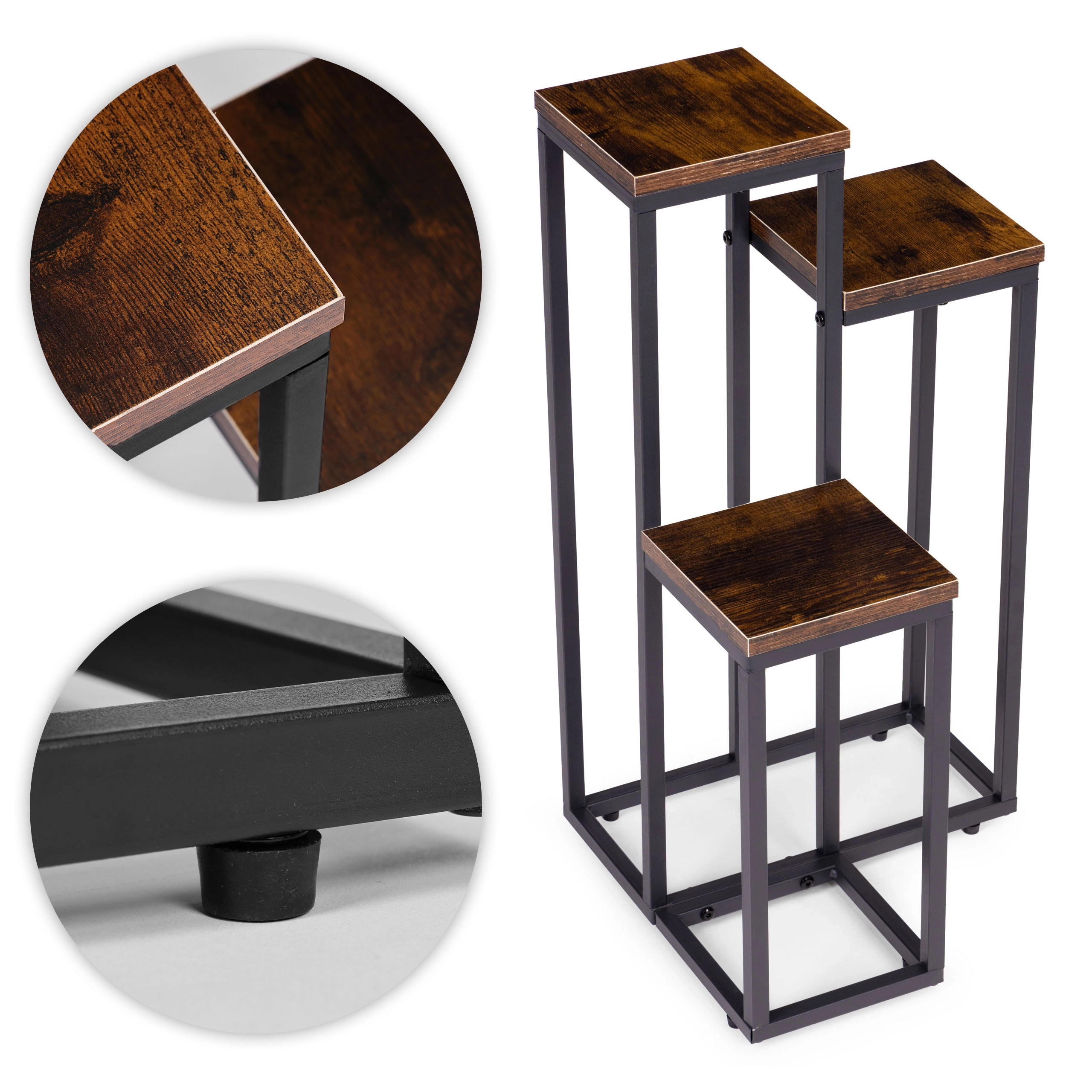 Le cadre en acier peint par poudrage résiste à la corrosion et à l’usure mécanique, tandis que les plateaux à l’aspect bois naturel soulignent le caractère loft moderne. Des pieds antidérapants augmentent la stabilité et protègent le sol des rayures. La capacité maximale de 5 kg est idéale pour la plupart des pots et décorations.