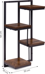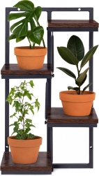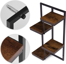 Le cadre robuste en acier thermolaqué résiste à la corrosion et à l’usure mécanique, tandis que les tablettes en panneau de particules laminé au décor bois apportent une touche chaleureuse. Une capacité de 20 kg assure la stabilité même pour des pots plus lourds et des décorations.