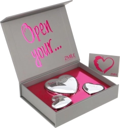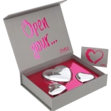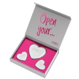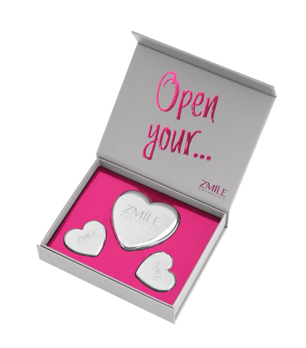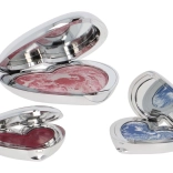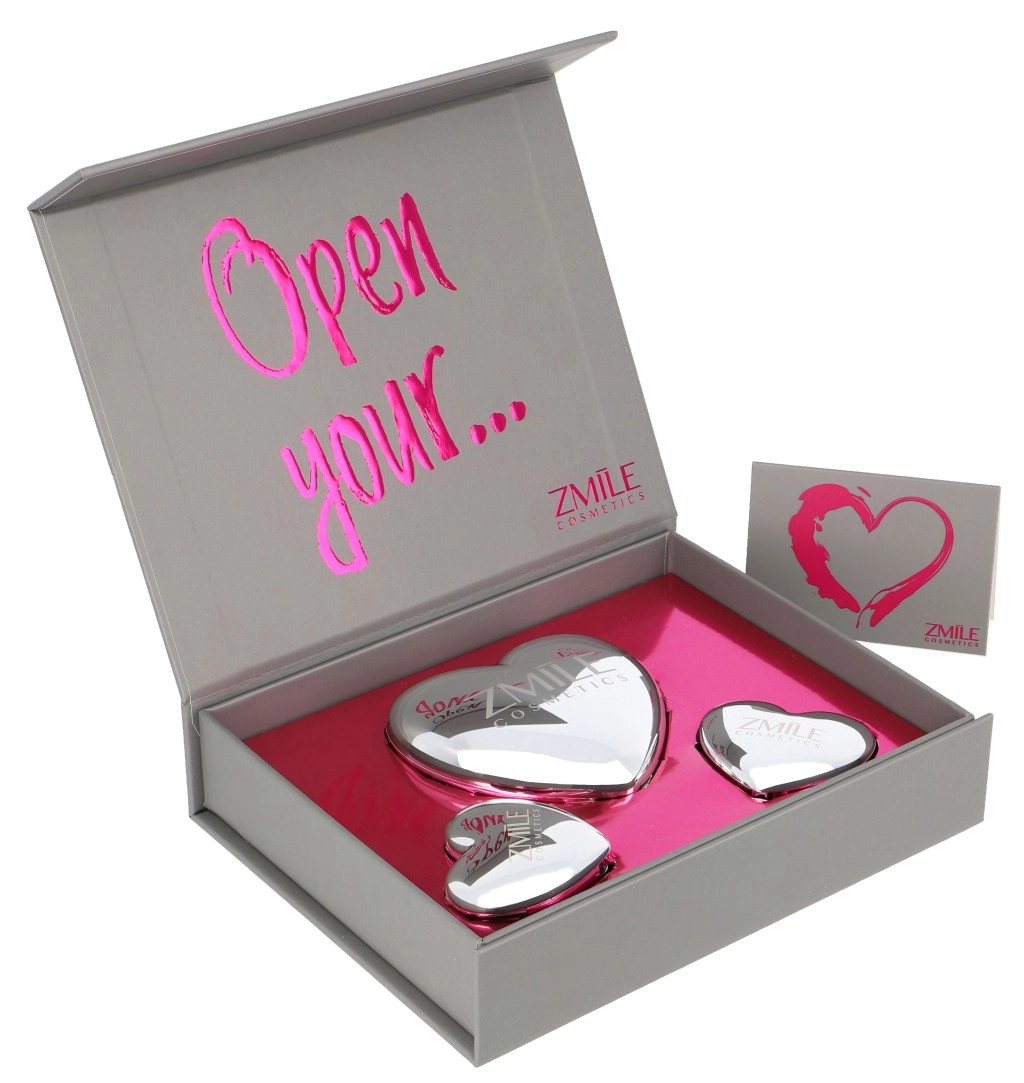 Chaque produit est présenté dans un écrin métallique en forme de cœur avec miroir intégré pour des retouches rapides à tout moment et en tout lieu.