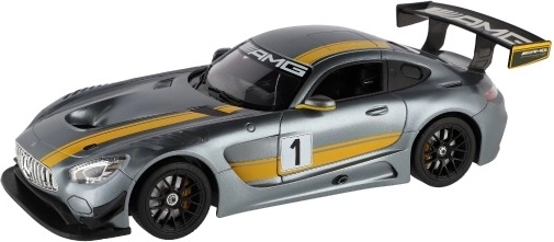 Découvrez le modèle RC MERCEDES-AMG GT3 finement réalisé en gris avec des bandes jaunes et un imposant aileron arrière. Sa carrosserie détaillée se distingue par des lignes sportives et des éléments authentiques d'une voiture de course, de quoi ravir tout amateur de voitures rapides.