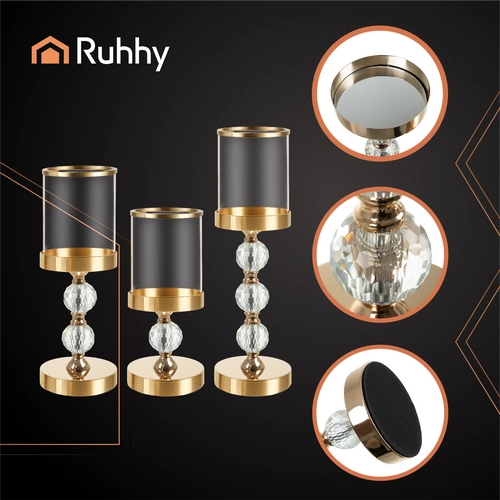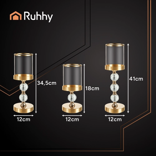 Un élégant ensemble de trois chandeliers RUHHY illumine chaque intérieur. La combinaison de verre, d’inserts miroir et de détails dorés crée un look glamour luxueux qui réfléchit magnifiquement la lumière des bougies. Une base stable et sûre protège les meubles des rayures et l’entretien facile garantit une utilisation pratique. Idéal sur une commode, une table, une cheminée ou comme cadeau stylé.
