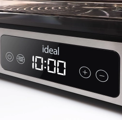 La commande est d’une simplicité maximale grâce au panneau LED électronique avec minuterie de 30 minutes à 24 heures. Son fonctionnement silencieux et économe en énergie convient au séchage nocturne, tandis que le design transparent permet de suivre l’avancement sans ouverture. Les plateaux disposent d’une hauteur réglable pour différentes tailles de tranches et l’appareil se démonte et se nettoie facilement.