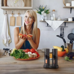 Découvrez le confort d’un assaisonnement automatique d’une seule main. Ce duo de moulins électriques combine un design moderne, une mouture précise et un entretien facile. Les fenêtres transparentes indiquent le contenu restant et la LED éclaire l’assiette ou la poêle pour un dosage exact des épices.