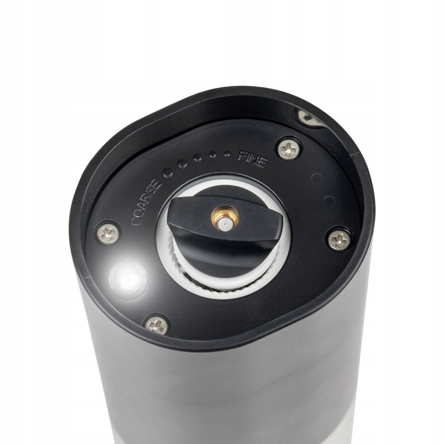 La bague inférieure permet d’ajuster la mouture en continu, de fine à grossière. La LED intégrée éclaire l’assiette ou la poêle pour un contrôle parfait.
