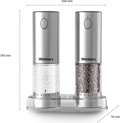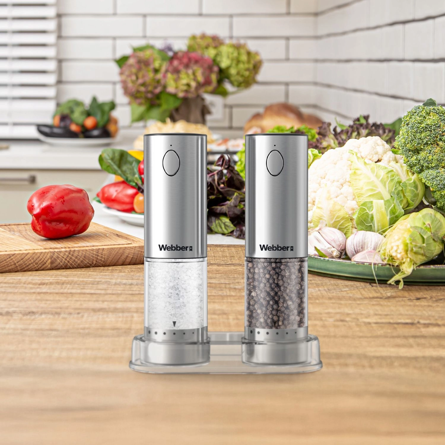 Ce set polyvalent de moulins électriques est idéal pour le sel, le poivre, les herbes séchées et autres épices. Grâce au contrôle simple par bouton unique et au réservoir transparent, vous gardez toujours un œil sur la quantité. La lampe LED sous le moulin facilite l’assaisonnement même en faible éclairage.