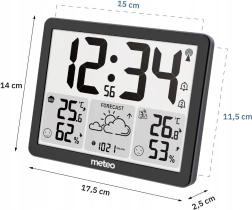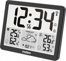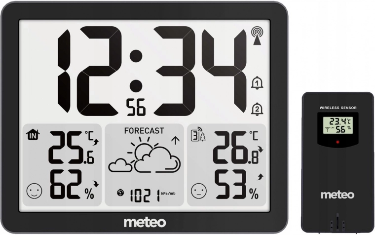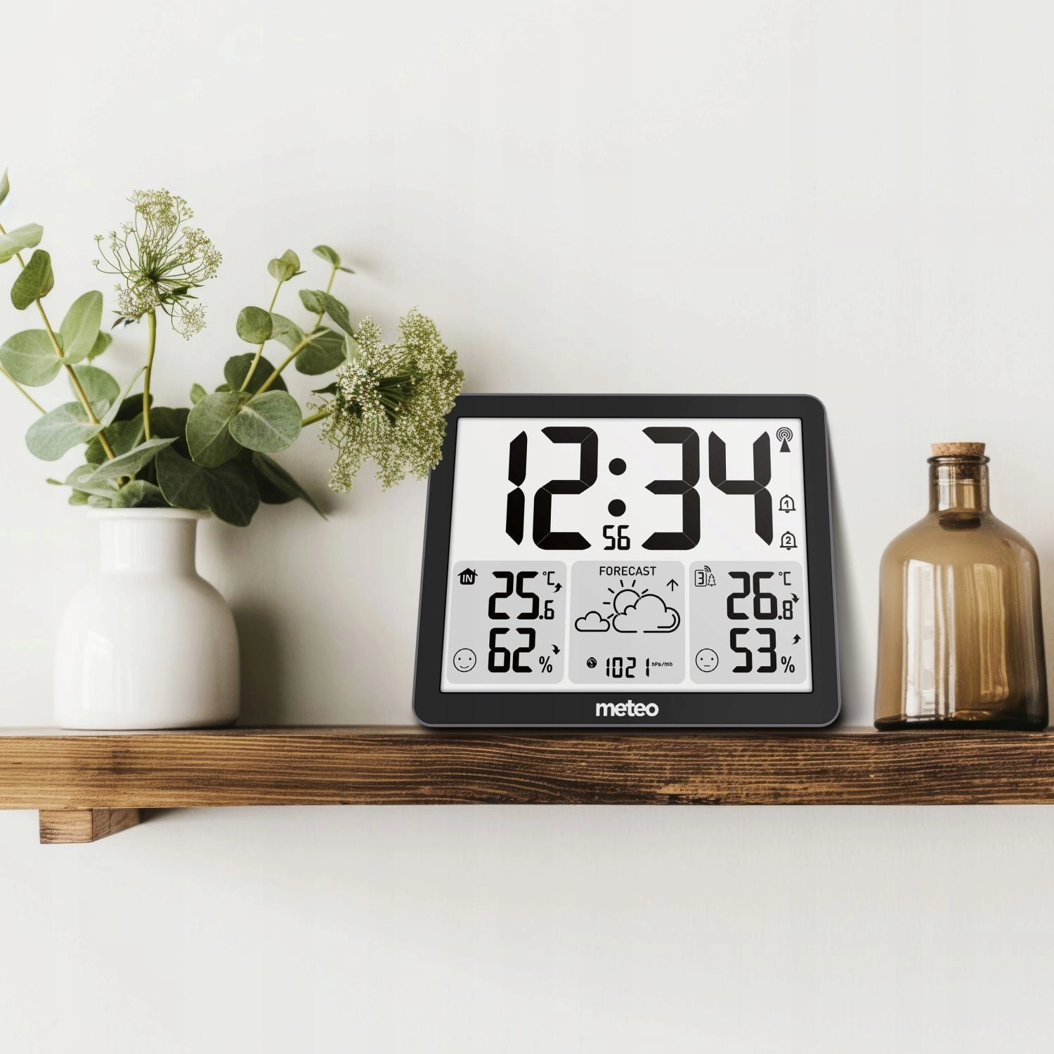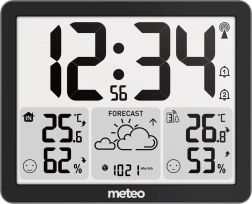 Pratique, la station météo numérique METEO avec heure radio-pilotée DCF précise affiche la température et l’humidité intérieures et extérieures, la pression barométrique et les prévisions météo via des icônes. Elle offre aussi la mémoire des min/max, des indicateurs de confort et de tendance ainsi qu’un réveil – idéale pour un aperçu quotidien du climat à la maison comme à l’extérieur.