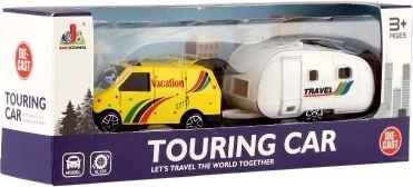 La voiture avec mini caravane est soigneusement détaillée pour éveiller l’intérêt pour le voyage et l’aventure.