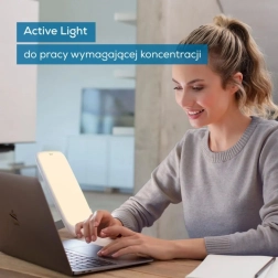 Grâce à 3 températures de lumière sélectionnables, adaptez facilement l’éclairage à votre rythme quotidien : Active (4300 K) pour un travail concentré le matin, Therapy (6500 K) pour une séance de luminothérapie à midi avec une intensité de 10 000 lx, et Relax (3000 K) pour une détente en soirée. Le contrôle tactile, le variateur 4 niveaux et le minuteur de séance en 4 paliers garantissent une utilisation confortable.