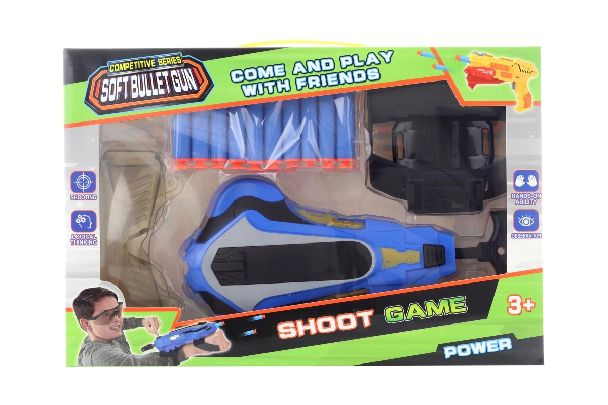 - Pistolet, porte-bras, 10 fléchettes en mousse, lunettes de protection