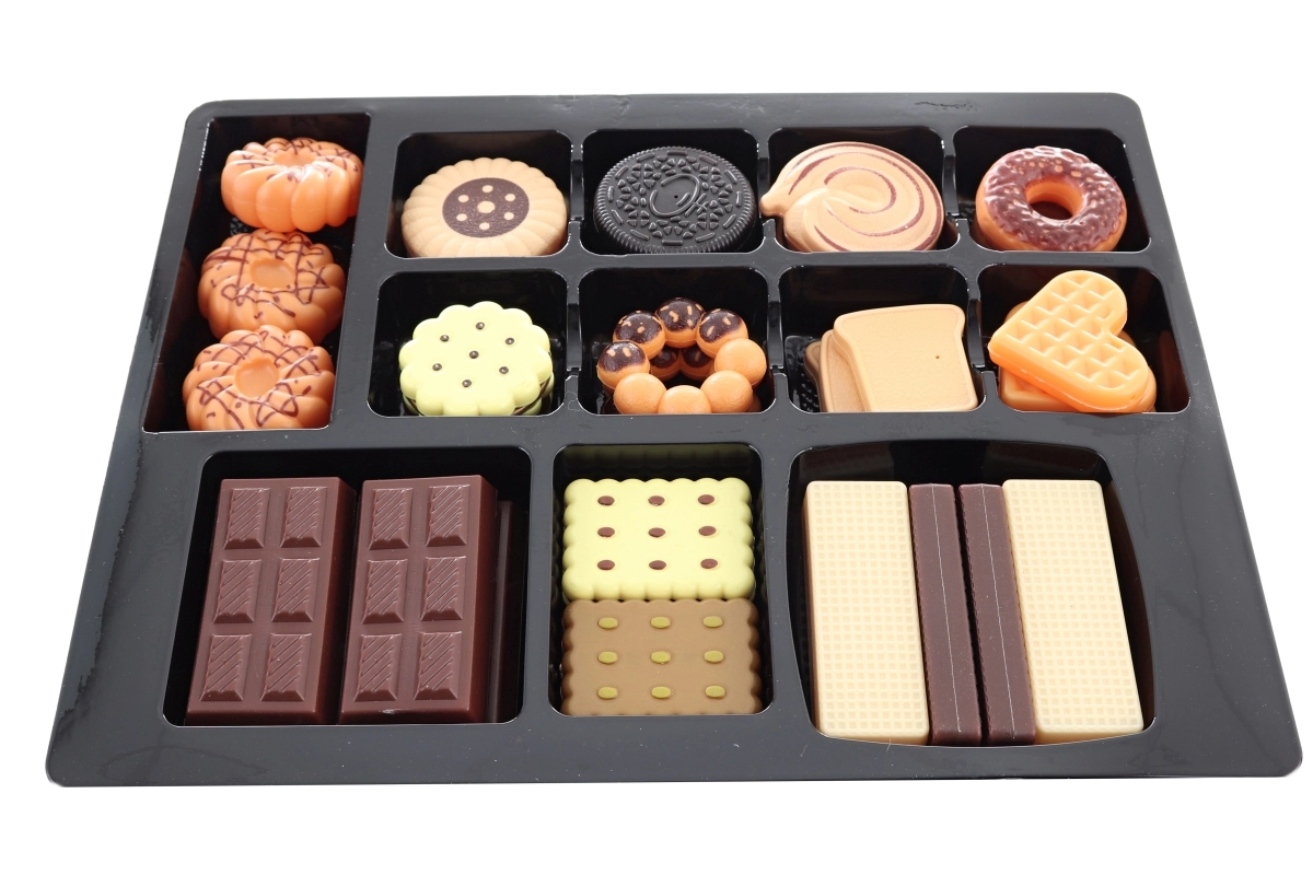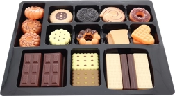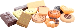Le set comprend une sélection de douceurs – gaufrettes, biscuits, chocolat et gaufres – idéal pour jouer au magasin ou à la cuisine. Son emballage pratique en boîte cadeau en fait un excellent présent pour les petits chefs.