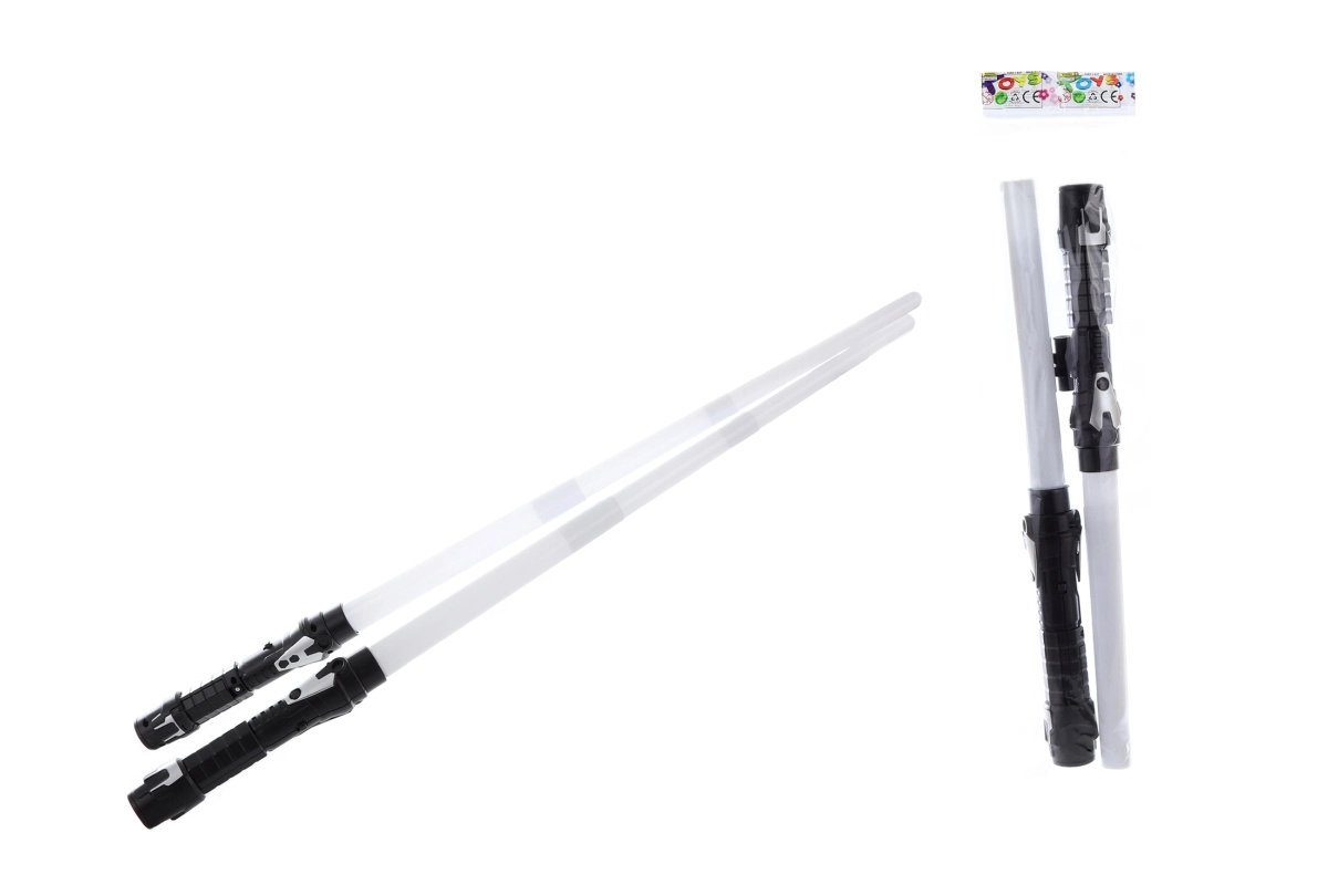 L’emballage est pratique, en sachet, dimensions env. 53 × 11 × 3,5 cm. Fonctionne avec 3× piles AAA par sabre (non incluses dans l’emballage).
