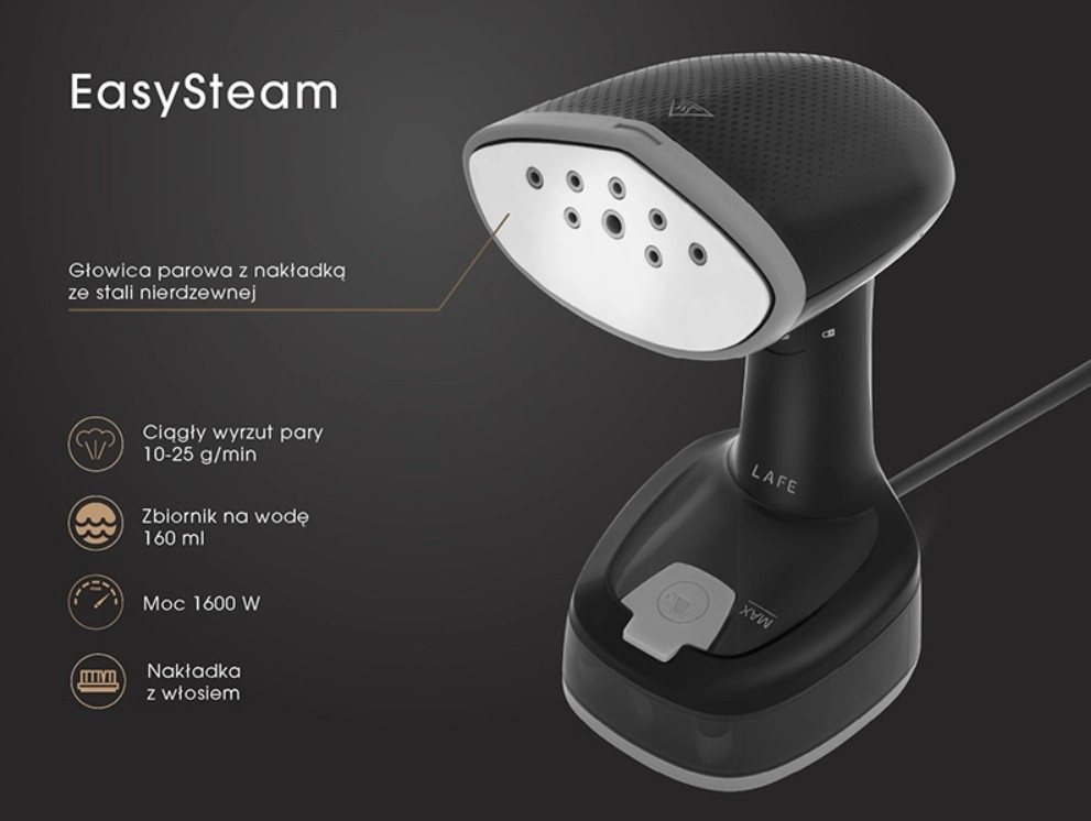 Lafe EasySteam est une alternative pratique au fer à repasser pour un lissage rapide et délicat des vêtements. Grâce à sa puissance de 1600 W et à son débit de vapeur stable de 15 à 25 g/min, il vient à bout des plis du quotidien sans abîmer les matières sensibles. La tête en acier inoxydable diffuse la vapeur uniformément pour un résultat efficace.