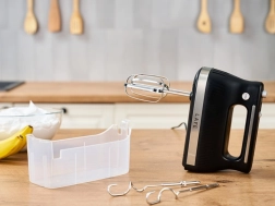 Le coffret comprend des fouets en acier inoxydable pour fouetter et des crochets pétrisseurs pour la pâte. Vous rangez le tout dans la boîte de rangement transparente, qui maintient accessoires et câble bien ordonnés au même endroit. Sa conception compacte et sa poignée ergonomique assurent une prise en main confortable et un nettoyage facile.