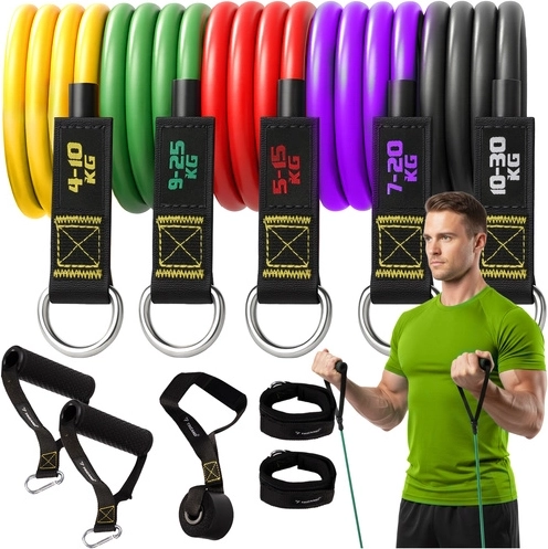 Ensemble complet d’élastiques de résistance TRIZAND pour un entraînement efficace à la maison comme en salle. Comprend 5 bandes avec charge de 4 à 30 kg, poignées main, sangles de cheville, butée de porte et étui. Grâce au latex résistant, à la grande élasticité et aux poignées antidérapantes, vous pouvez entraîner en toute sécurité tout le corps – dos, bras, jambes, abdos et fessiers.
