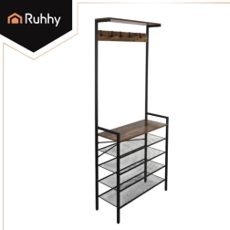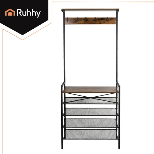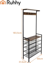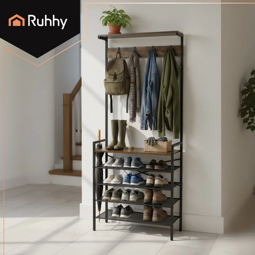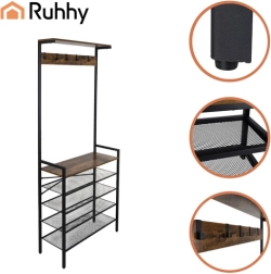 Organisez manteaux, chaussures et accessoires en un seul endroit. Le portemanteau d’entrée RUHHY au style industriel associe une structure métallique durable à l’esthétique naturelle du bois. Grâce aux étagères en treillis, les chaussures respirent mieux et sèchent plus vite, l’étagère supérieure accueille bonnets ou écharpes, et les crochets gardent manteaux et sacs à portée de main.