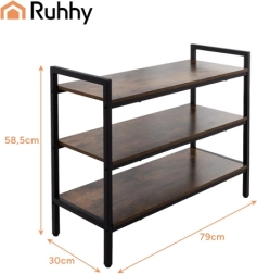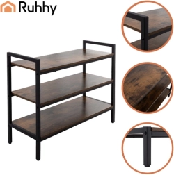 Le meuble à chaussures RUHHY au style loft allie fonctionnalité, stabilité et élégance. Trois étagères robustes avec une capacité de 30 kg chacune accueilleront les chaussures de toute la famille, tandis que le cadre métallique durable et les plateaux en bois au ton chaleureux apportent une touche moderne à votre intérieur. Ses dimensions compactes 79 × 30 × 58,5 cm économisent de l’espace et les patins de protection évitent les rayures sur le sol.