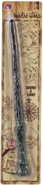 Baguette magique pour petits magiciens avec effets lumineux et sonores. Accessoire idéal pour un costume, longueur 36 cm, plastique résistant. Piles 3× AG13 incluses, convient dès 3 ans.